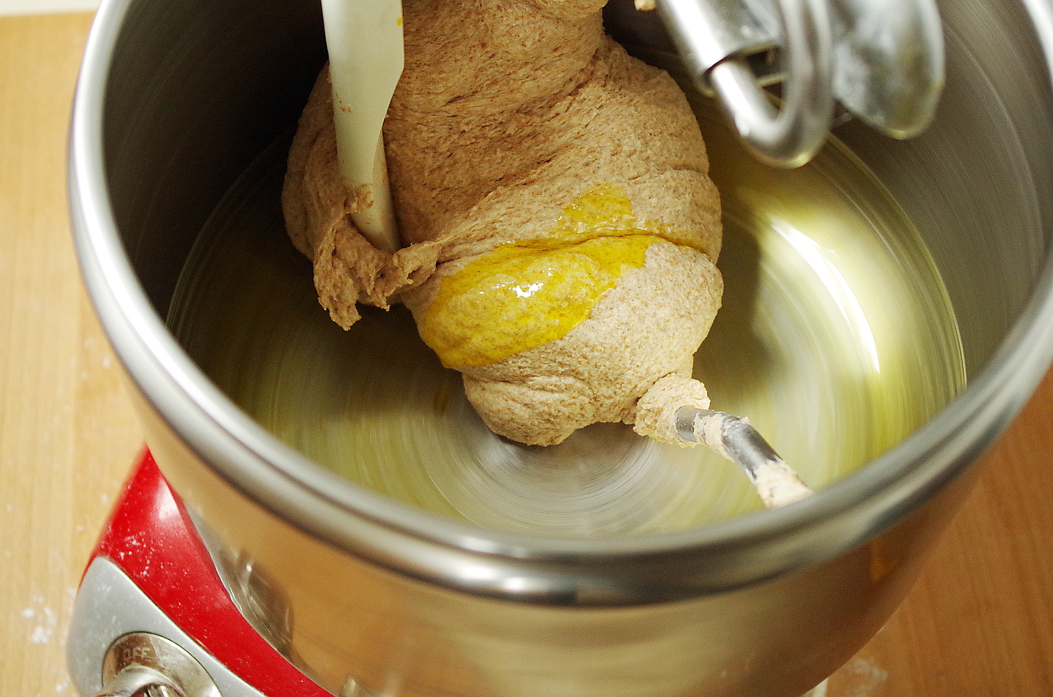 - Я замешивала тесто в тестомесе Ankarsrum Original, начала с аутолиза, смешав закваску, муку и воду до полного увлажнения муки и оставив все это на 15-20 минут. Если вы замешиваете в спиральном миксере типа китчен эйда, ход действий такой же, если используете свои собственные золотые руки – просто смешайте все, кроме соли и масла в прозрачной миске или контейнере.
