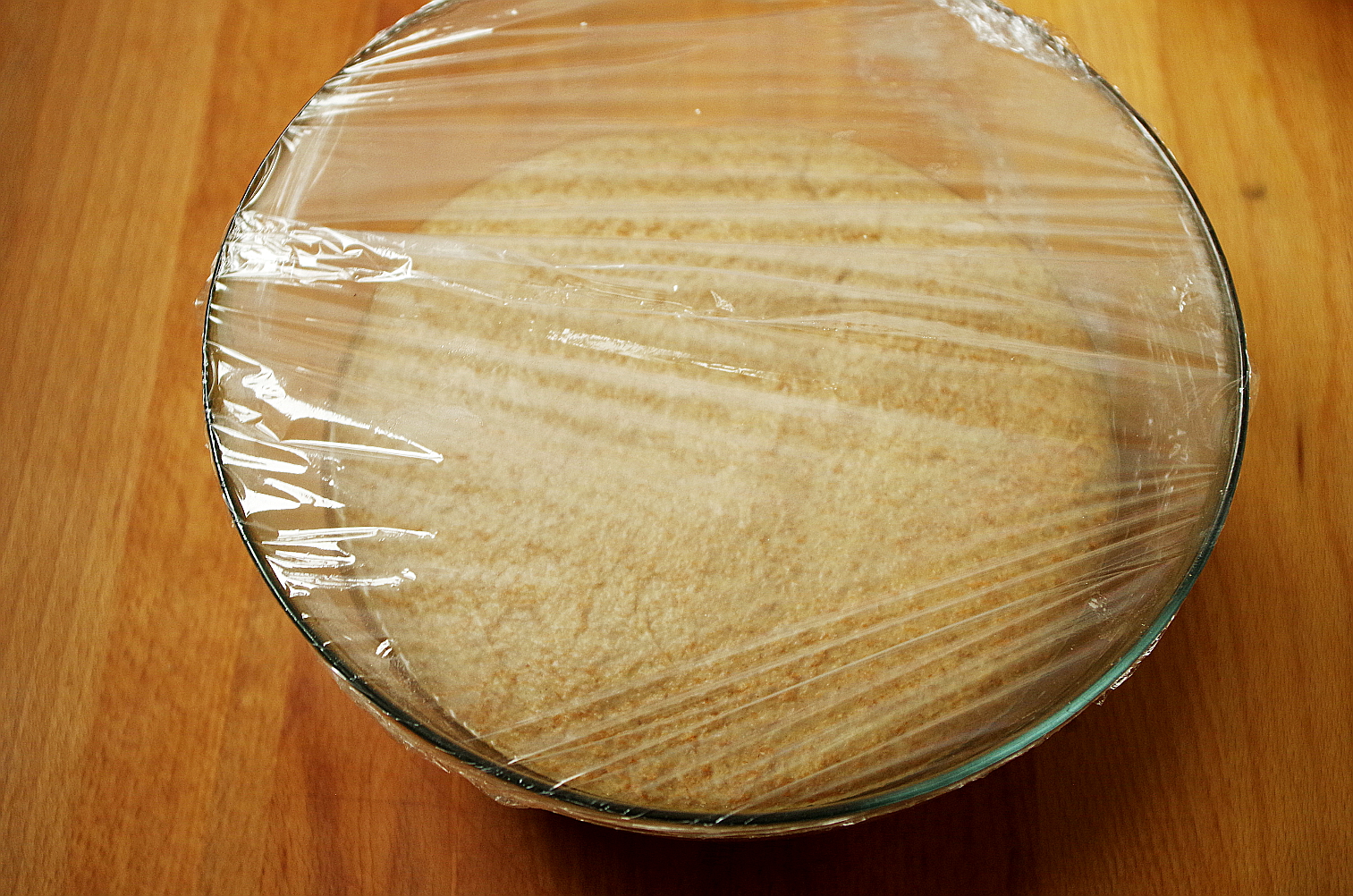 - Достаньте тесто, сверните в тугой шар и положите в прозрачную миску или контейнер, смазанный растительным маслом, затяните пленкой или закройте крышкой.
