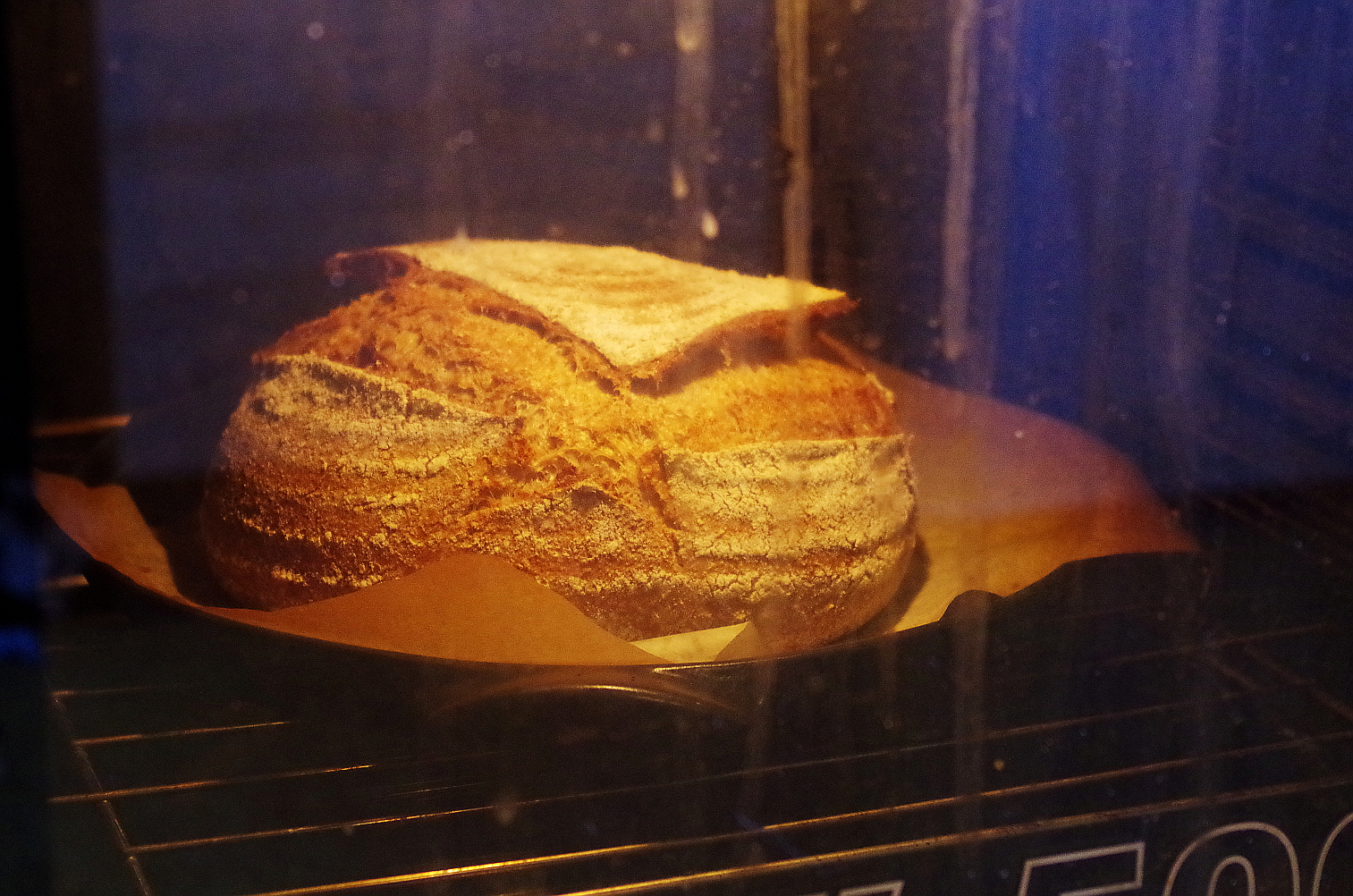 4) Пар делайте или с помощью колпака/казана/миски, или раскаляйте на дне духовки чугунную сковороду и, посадив хлеб в печь, тут же плещите на эту сковороду примерно 2/3 стакана кипятка. Можете поискать в верхней части духовки отверстие для выхода пара и влаги и заткнуть его фольгой.
