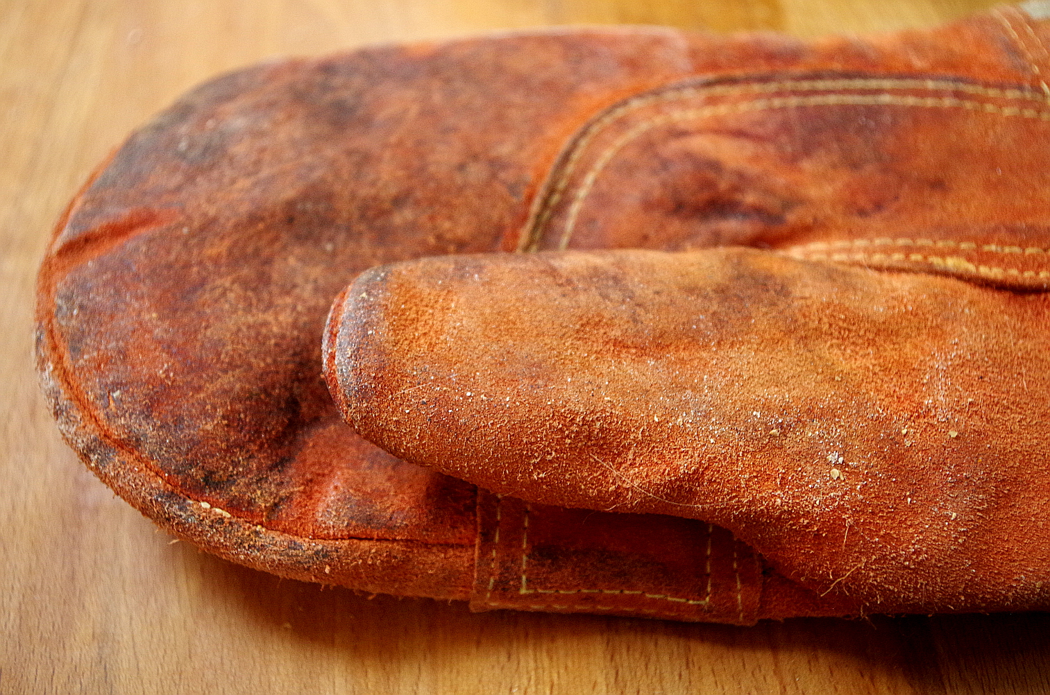 Для колпака и всяких раскаленных предметов у меня есть супер-рукавицы Matfer, которые выдерживают практически любой жар, они уже слегка замучены, как видите, но от этого хуже не становятся.
