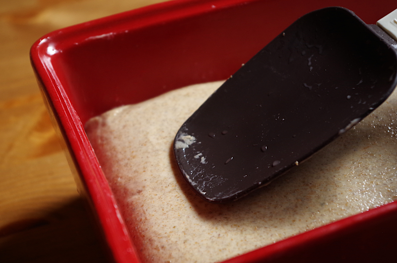 Огладьте поверхность хлеба до идеально ровного состояния, используя мягкий пластиковый или силиконовый шпатель, формируя у хлеба не вогнутую, а выпуклую верхушку.