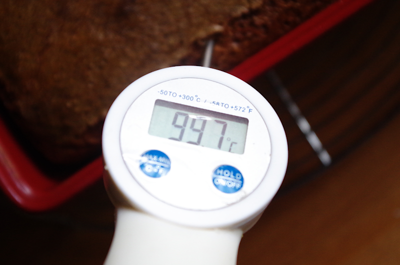 Проверяю готовность так: достаю форму с хлебом, духовку закрываю, ставлю хлеб в форме на решетке, измеряю температуру, при необходимости возвращаю его снова в духовку)