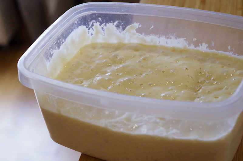 Аутолиз. Смешайте закваску, желтки, молоко и муку до однородности, оставьте на 30 мин для аутолиза, чтоб набухли грубые частицы цельнозерновой муки и пшеничный белок.