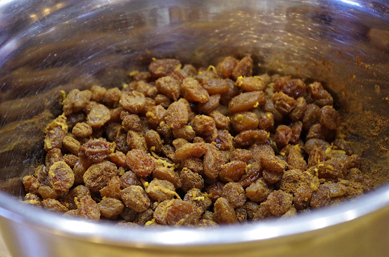 Изюм на 5 мин. залейте кипятком, слейте, остудите, добавьте мелко рубленные цукаты (если используете) цедру и специи, перемешайте.