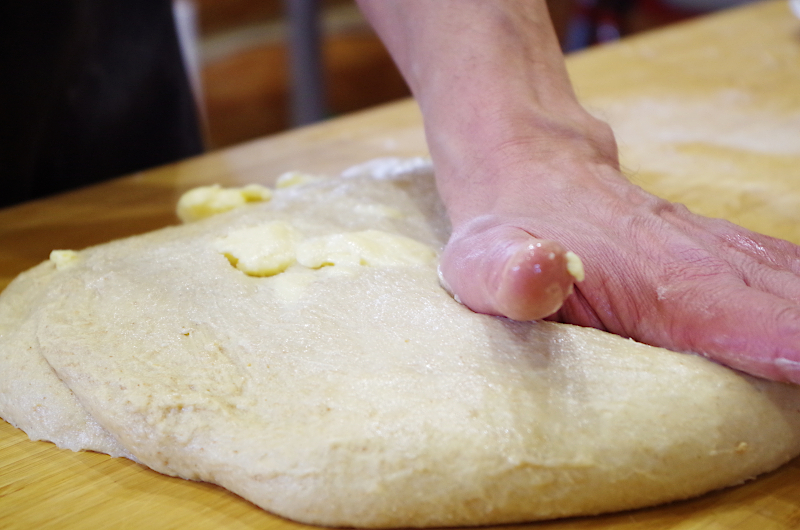 Масло вмешивайте подобно сахару: тесто растяните в лепешку, распределите по ней масло, массажными движениями вотрите, соберите тесто и начните замес.