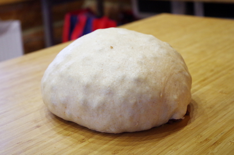 В самом конце замеса внесите смесь изюма и сухофруктов. Если замес в тестомесе, то на 1 скорости, если вручную, то тонко растяните тесто и равномерно распределите изюм, потом сложите тесто в шар, при желании немного промесите его.