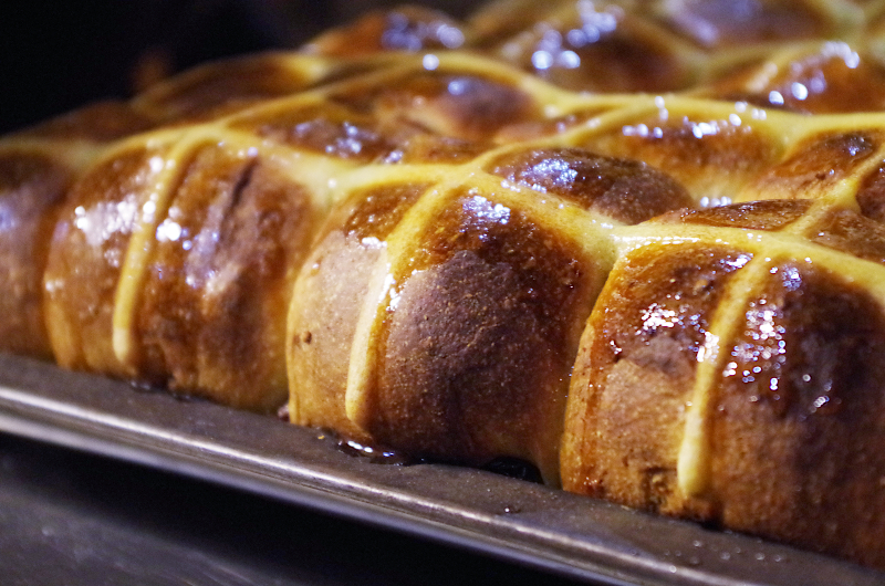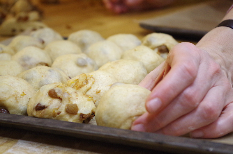 Дорогие друзья, спешу в блог с новым рецептом, который удивил нас всех и который мы даже уже показали на мастер-классе в Москве! Пасхальные крестовые булочки родом из Англии, там они традиционные и это просто гениально! Они мягкие, нежные, сдобные, сладкие, нарядные, как куличи, но сдобы в них практически вдвое меньше! Представляете, меньше сахара, меньше масла и яиц, а по ним и не скажешь)) А чтоб эти булочки стали еще интереснее, мы заменили часть белой муки на цельнозерновую. При желании вы можете увеличить содержание цз, ориентируясь на свой вкус и особенности цельнозерновой муки: тесто с ней бродит быстрее, быстрее расслабляется и может плыть, особенно при слабой формовке.