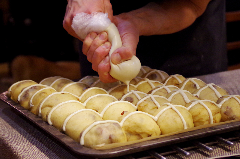 Смесь для крестиков. Смешайте муку и воду для рисования крестиков, вылейте в кондитерский мешок или прочный пакет, отрежьте уголок так, чтоб получилось маленькое и аккуратное отверстие. Нарисуйте сначала полоски сначала в одну сторону, потом в другую, не прерывая линии. Каждую отдельную булочку вырисовывать замучаетесь, поскольку смесь тянется.