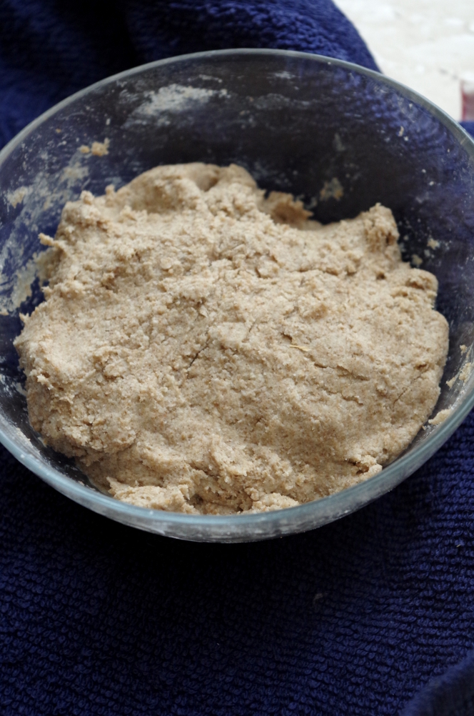 Смешиваем муку и воду, пока не добавляя закваску, соль и мед. Должна получиться комковатая грубая масса. Накрываем пленкой или пакетом, чтобы не обветрилась и оставляем на час для аутолиза.