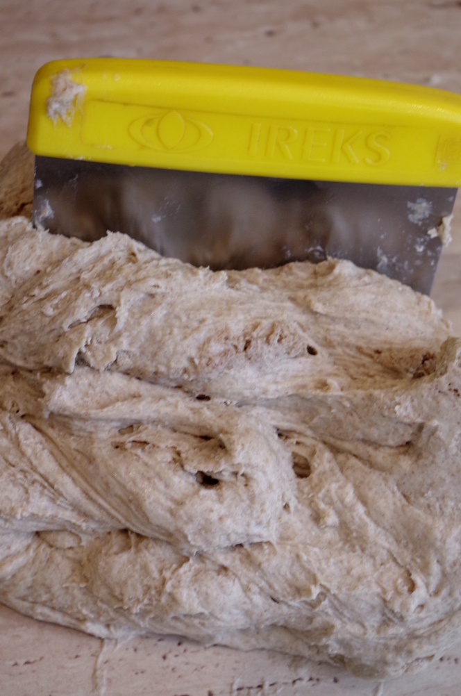 Вернулась к тесту. Если замешиваете тесто в комбайне или хлебопечи, просто добавляете все ингредиенты в дежу и замешиваете до гладкости. Если работаете вручную, то без скребка не обойтись. Я выложила тесто и закваску на стол, смазанный растительным маслом.