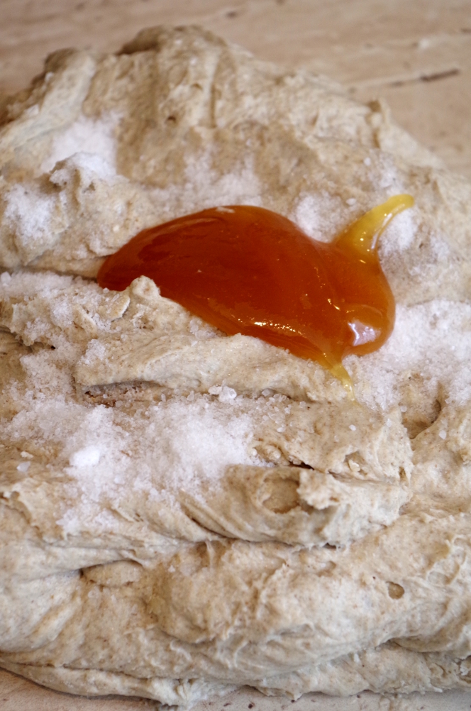 Добавила соль и мед, начала замес, сворачивая тесто внутрь, пока не добилась однородности. Далее работала руками.