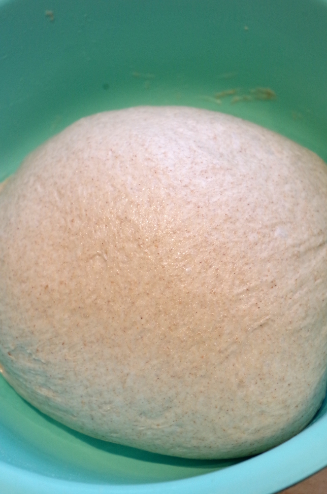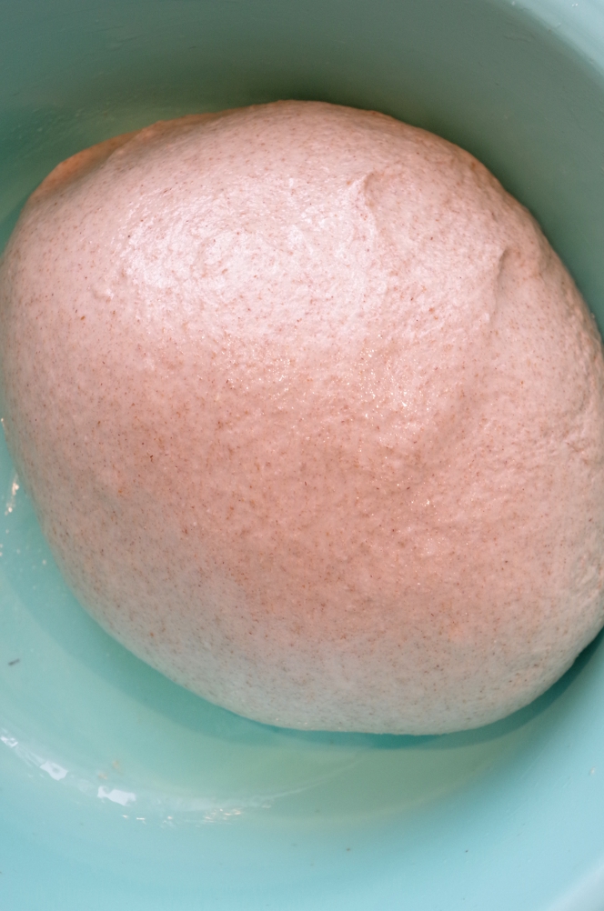 Разделила тесто на две части, одну подкатала в шар и уложила подходить в смазанную растительным маслом миску.