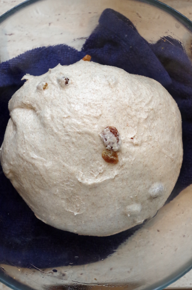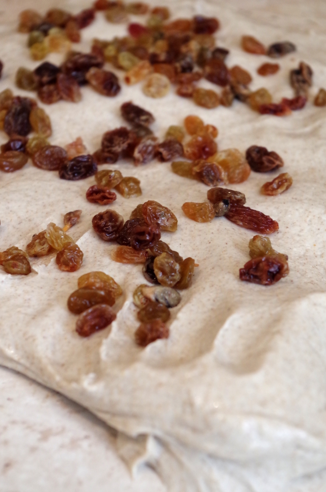 Вторую часть теста распластала на столе и посыпала изюмом и вымесила до однородности. Свернула в шар и уложила расстаиваться в другой миске, смазанной маслом. Обе миски затянула пленкой.