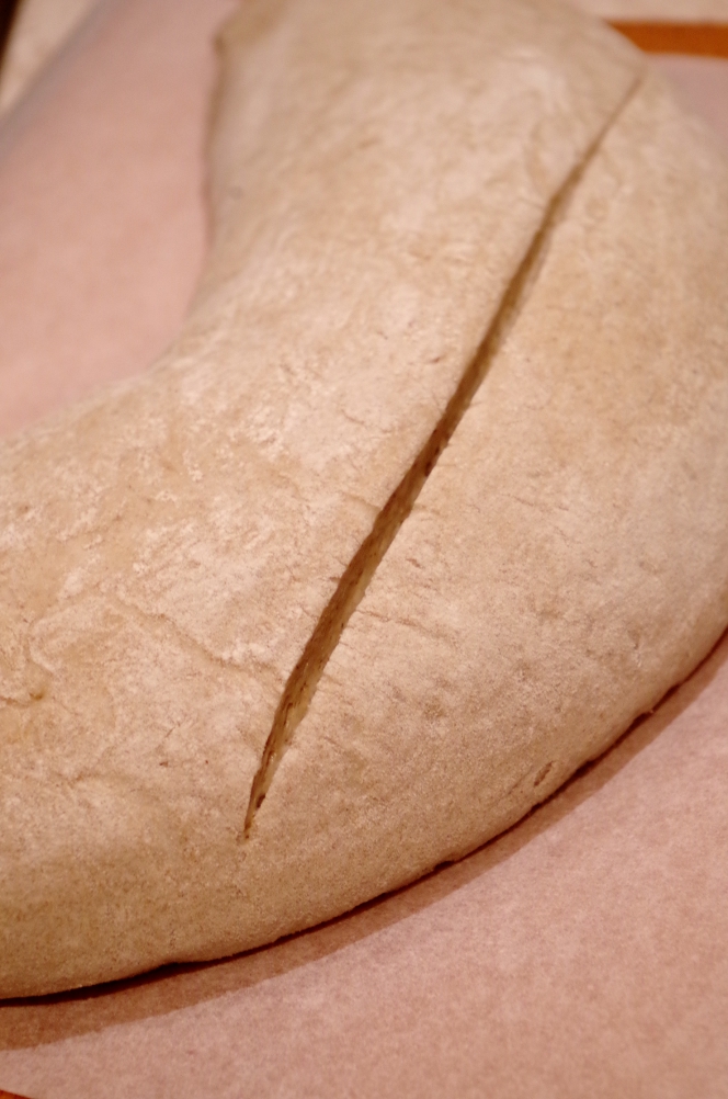 Далее я смазала стол маслом и, выложив заготовки, подкатала их в шар. 5-10 минут отдыха, формовка круглой и овальной заготовки, расстойка на льняном полотенце, щедро натертом мукой. Можно растаивать и в корзинах, честно говоря, я бы так и сделала, если бы они были под рукой, но хлеб этот я пекла в гостях, поэтому вариант с полотенцем вполне подошел.