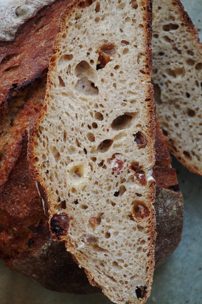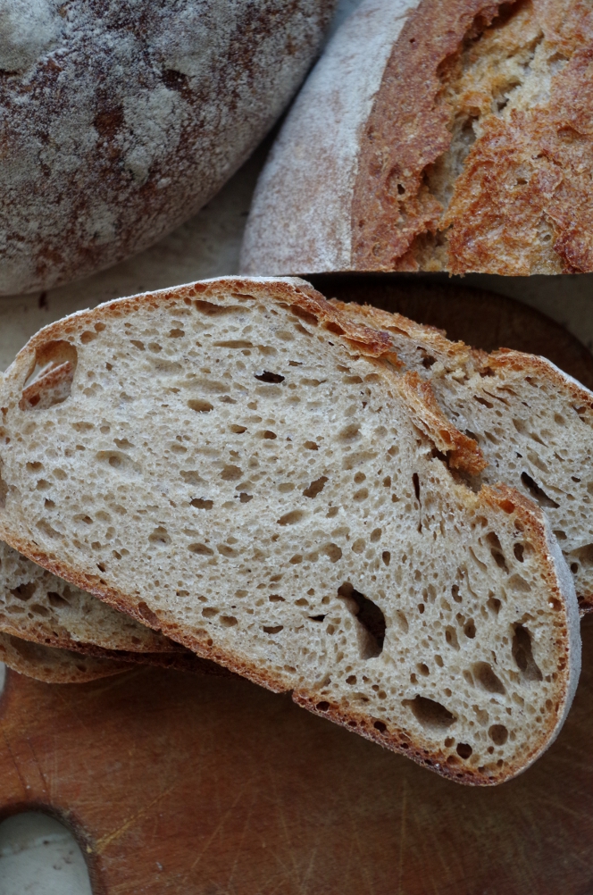 Расстойка в тепле 1,5-2 часа. Духовку разогреваем заранее вместе с противнем, камнем или чугуном, в зависимости от возможностей и условий. Как я уже писала выше, пекла хлеб не дома, поэтому не только корзинок, но и камня не было (и, признаться, очень не хватало), и я использовала обычный противень. Когда пекла "Мечту" по рецепту Сергея, противень не разогревала и низ хлеба по периметру сильно потрескался. Оказалось, это как раз из-за холодного пода – из-за разницы температур хлеб трескается так, что дно может отойти, а внутри хлеба в нижней его части может образоваться закал – полоса плотного непропеченного мякиша. По характеру пор тоже видно, что хлеб на холодном противне немного поплыл, поры горизонтально направлены, но закала не образовалось.