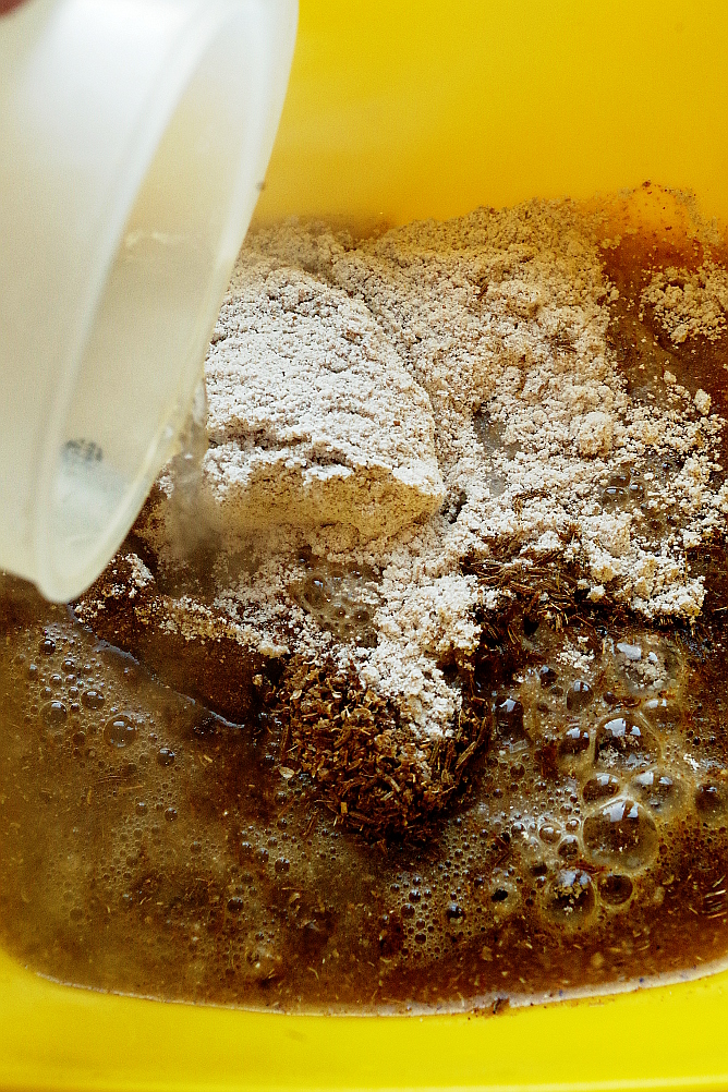 В миске смешайте все ингредиенты, залейте кипятком, хорошо перемешайте, накройте крышкой, спрячьте в теплое место, пока не понадобится.