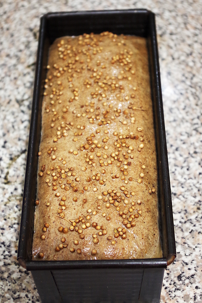 Вывалите тесто на смазанный маслом или водой стол, не обминая, сформуйте продолговатую заготовку, огладьте ее руками, чтобы не осталос неровностей. Я начала формовать уже в большой аше тестомеса. В общем-то, можно тесто выложить прямо в форму и там ложкой или мокрыми руками пригладить верхушку. Брожение 50-60 минут при комнатной температуре, заготовку при этом лучше накрыть пакетом или банной шапочкой, чтобы поверхность не заветрилась. Расстоявшийся хлеб сбрызните или смажьте водой, посыпьте кориандром