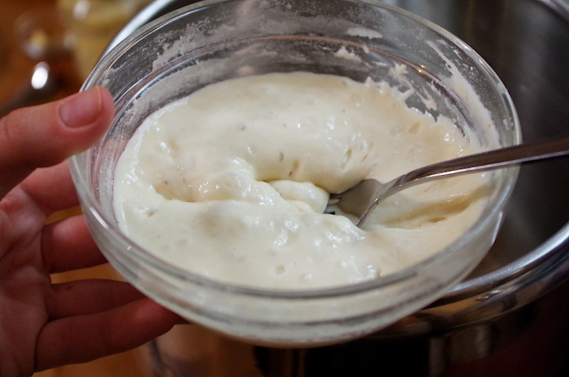 На 1й скорости тестомеса (у меня тестомес Ankarsrum) смешайте закваску, яйца и желтки, всю муку и воду до увлажнения муки и оставить на 30 мин. Тесто должно собраться в липковатый комок, но оно не должно быть влажным или сильно вязким, если у вас получилось такое, вы можете добавить 50-70 гр. муки. Если у вас жарко, используйте ледяную воду или ставьте тесто на аутолиз в холодильник.