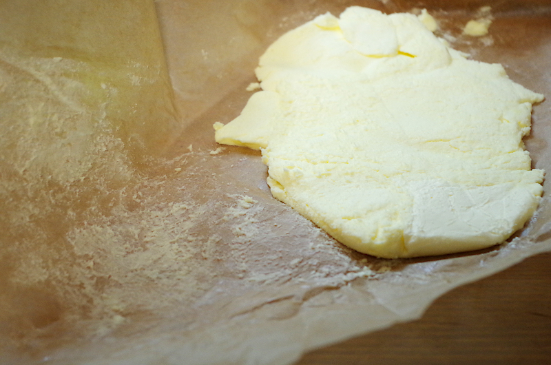 Масло должно быть холодным и твердым (из холодильника), и, чтобы придать ему пластичности, заверните масло в пленку или пергамент и отбейте (поколотите) скалкой до пластичного состояния.