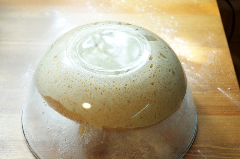 Брожение около 5-7 часов при температуре 22-23°. Если дело дело ближе к ночи, вы можете спрятать тесто в холодильник до утра, оно там будет бродить короткое время, а потом практически остановится. Через два часа после начала брожения один раз сложите тесто или проведите ламинирование.