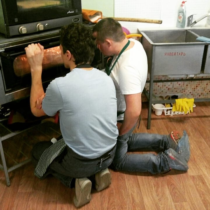 Уже на второй день один пекарь просто не пришел, впрочем, этого можно было ожидать, такое часто случается. На его место пришел другой, который тоже через пару дней сошел с дистанции, но ситуацию спасла девушка Юля, которая тоже – булочница со стажем, но при этом смогла с ходу уловить тонкости и включиться в процесс. Недели обучения в таком режиме, конечно, мало, но ее вполне хватило, чтобы научить людей базовым технологиям работы с подовым хлебом, влажным тестом, багетами, научить вести закваску, разумно пользоваться оборудованием, продумать и проработать график выпечки без ночных смен, но так, чтоб хлеб был готов к утру. В день отъезда мы оставили наших пекарей в покое, чтоб посмотреть, как они справятся сами, как и кода испекут хлеб, просто наблюдали за работой. И было очень приятно увидеть, что у них все получилось!
