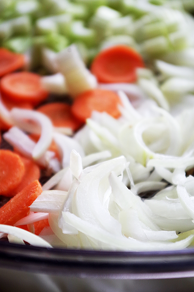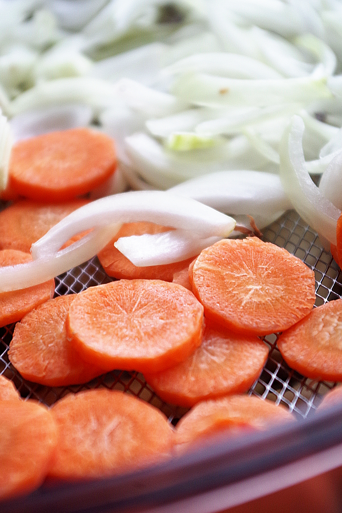 На лотках разложила сельдерей (порезанный поперек поперек волокон), морковку (тонкими кружочками), лук (перьями).
