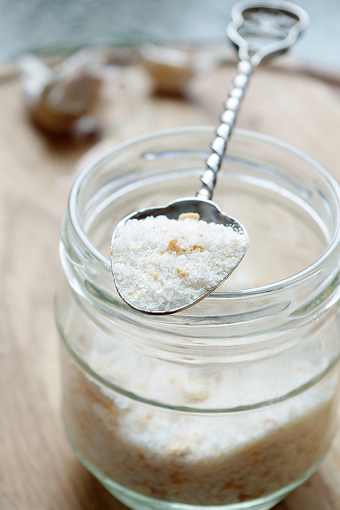 Для чесночной соли я взяла высушенный чеснок, хорошенько разбила его в ступке, добавила 3-4 ст.л. морской соли и хорошенько перетерла еще раз. Теперь приправляю ею все подряд, пока не надоела))