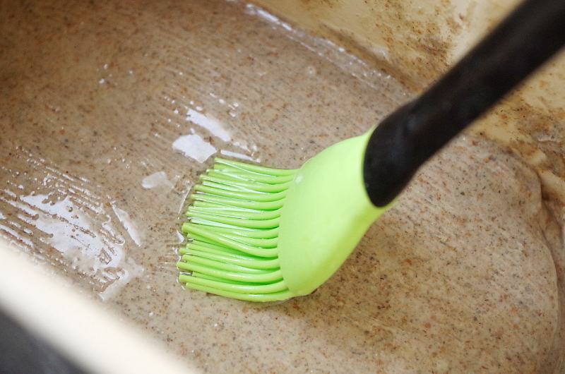 Сразу после замеса я достала лопатки, разровняла тесто мокрой силиконовой лопаткой и мокрыми руками до гладкости, и смазала поверхность хлеба растительным маслом.