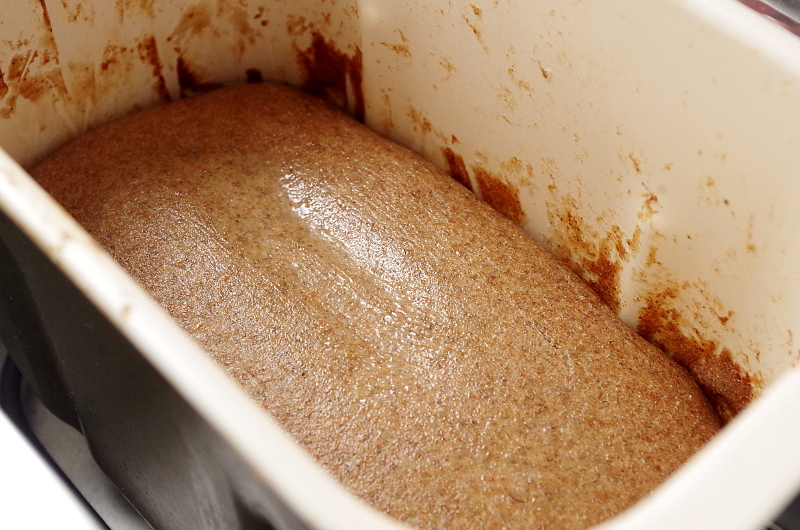 3. Засыпаю ингредиенты в хлебопечку по описанной ранее технологии. (в этот раз после замеса на расстойку оставил 1,5 часа, за меньший срок тесто не подымалось, поднялось чуть больше чем на половину).