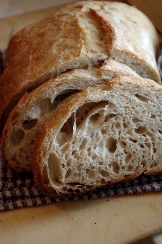 С таким тестом не получится работать, это понятно и неискушенному пекарю. Чтобы из такого теста получить хлеб, мне пришлось добавить около 100 гр. муки. Ну, и, само собой, он получился более плотным, чем должен быть, вот таким: