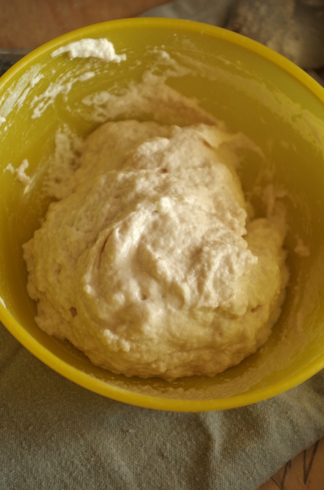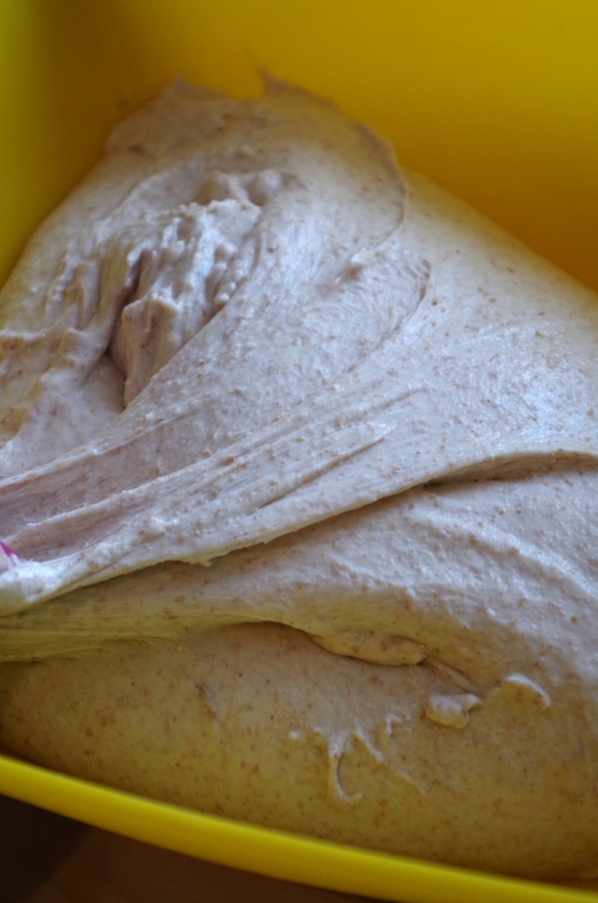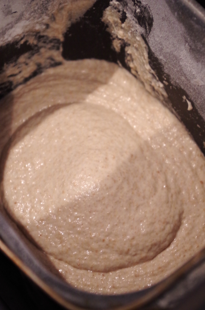 То, что мука может быть разной и влиять на консистенцию теста, это полбеды, его же нужно еще правильно замесить! Я почему-то и тут стормозила, притом, что с влажным тестом работала не раз и с особенностями замеса знакома. Но тут память отшибло. Тесто для «берета» делается из смеси пшеничной муки высшего сорта и цельнозерновой, влажность 77,5%, если я правильно посчитала, а это значит, что воды в нем немало, и, если его замешивать, как обычно – высыпать сразу все ингредиенты в дежу и включить кнопку старта, получится вот что: