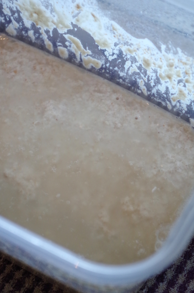 Я заметила разницу в муке, когда ставила производственную опару на бакферменте. Я ее делаю 100%й влажности, используя 300 гр. вышки и 100 гр. цельнозерновой муки. Обычно, чтобы добиться однородного теста, приходится попыхтеть. А когда поставила опару на магазинной вышке и цельнозерновой, получила более жидкую консистенцию. Уже к следующему утру на поверхности опары отсеклась жидкость, чего не происходило с опарой на «старой» сухой муке. На фото ниже первый вариант на "свежей" вышке, второй - на "старой" на второй день.