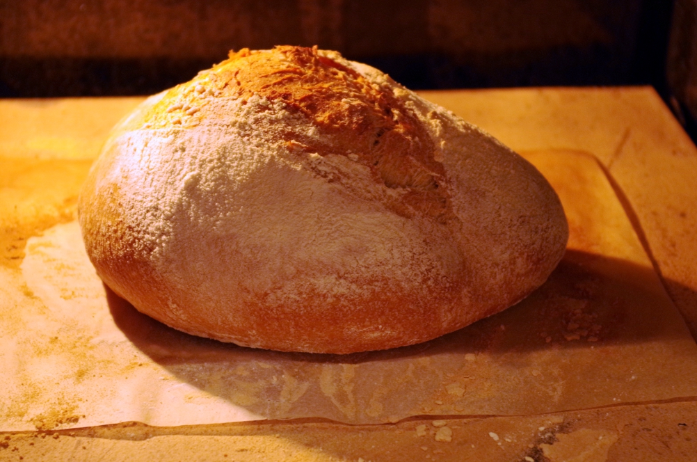 Важно, чтобы не просто вся вода вошла в тесто, но что бы оно при этом было правильной консистенции, с хорошо развитой клейковиной, нелипким и упругим. Если тесто недомесить, оно будет липнуть к рукам и расплываться, его будет сложно формовать и хорошей плотной заготовки не получится, на расстойке оно поплывет, во время надреза нож увязнет в тесте, а во время выпечки расползется широкой гладкой улыбкой. Вот, к примеру: