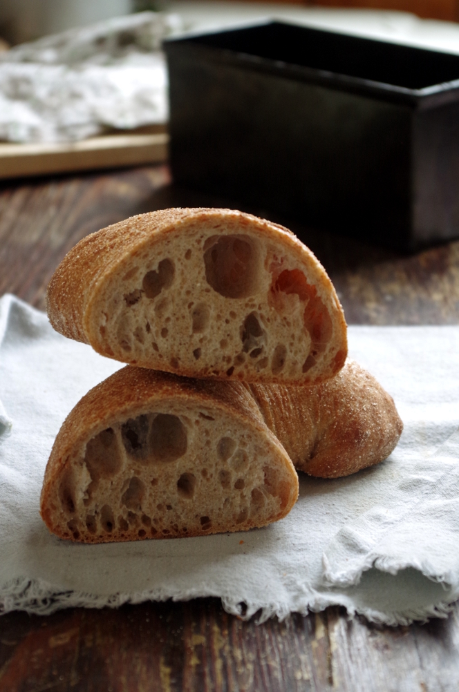 Корзинки же позволят вам выпекать батоны и караваи, экспериментировать с надрезами и формовкой, кроме того, мне безумно нравится рисунок, который корзинки оставляют на хлебе. Мякиш в таком хлебе хаотично пористый, красивый, корка тверже. Есть семьи, в которых форма кирпичика привычна и домашний хлеб выпекают именно такой, им корзинки не нужны)