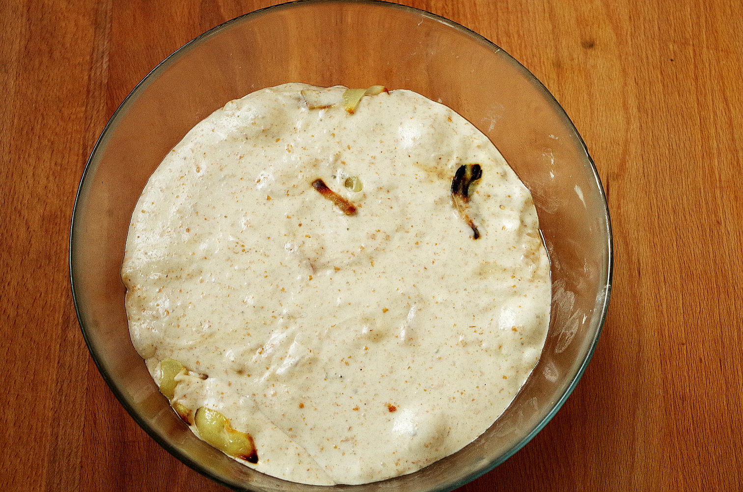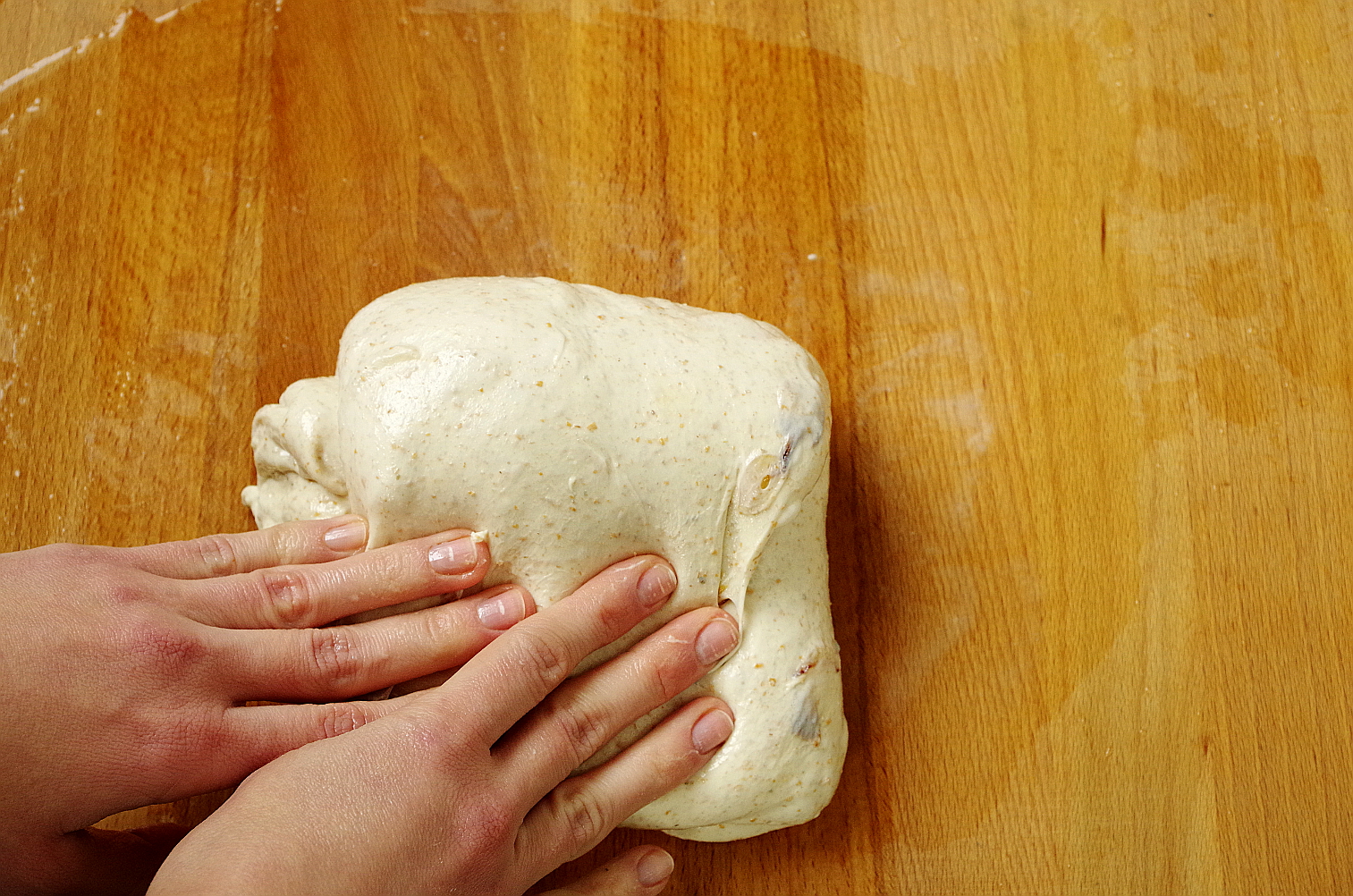 - После последнего складывания брожение еще 2,5-3 часа при 22 градусах. Если у вас теплее, дело пойдет быстрее, ориентируйтесь на поведение теста.