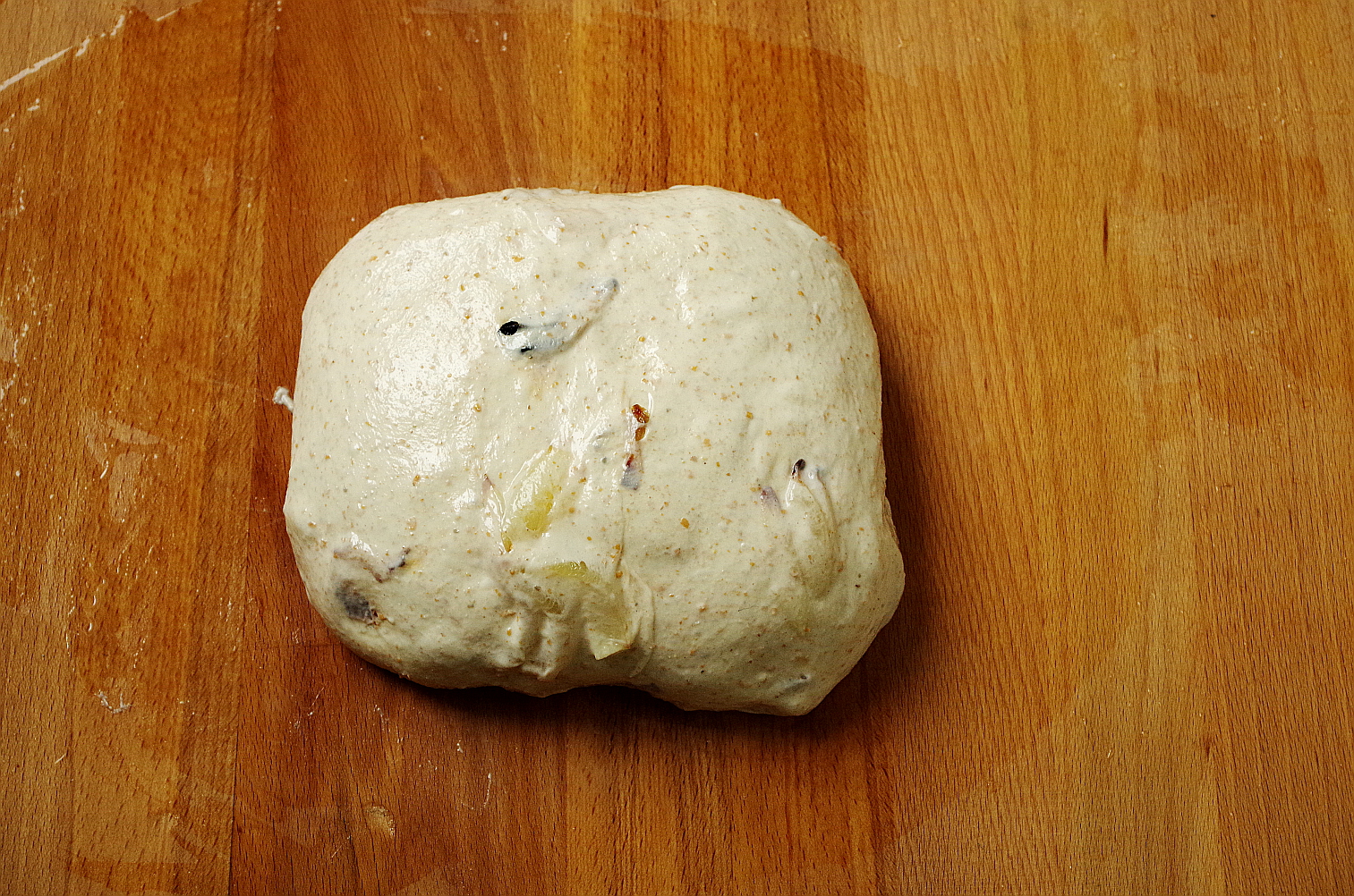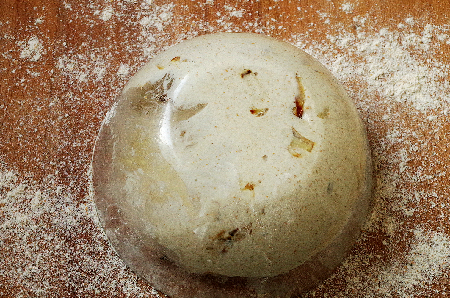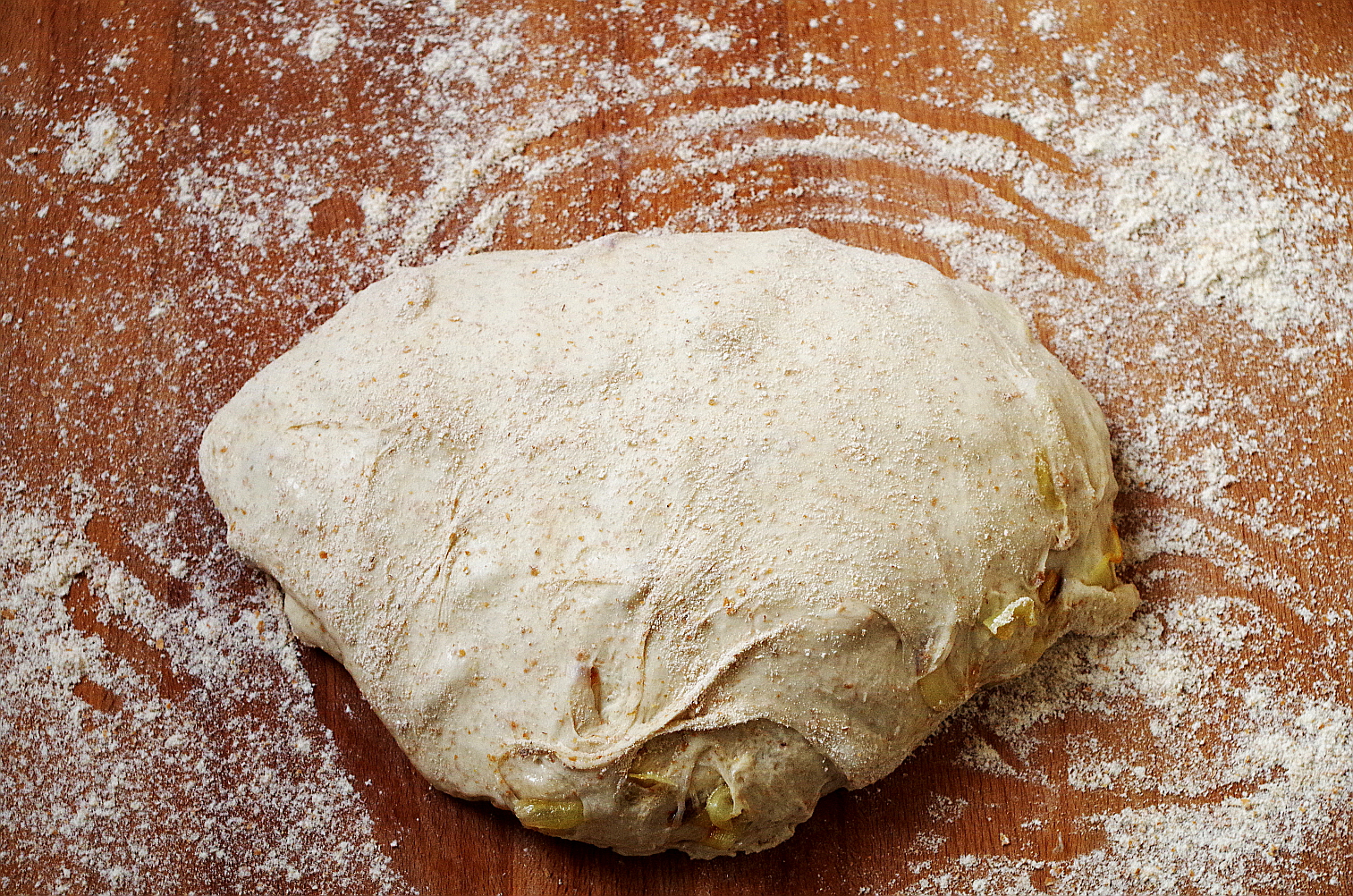 - Через полчаса растяните тесто на рабочей поверхности, смоченной водой, внесите большую часть лука. Хорошо растягивая края, сложите тесто конвертом, внесите оставшийся лук, сложите тесто в шар и верните в миску. Через полчаса повторите складывание.