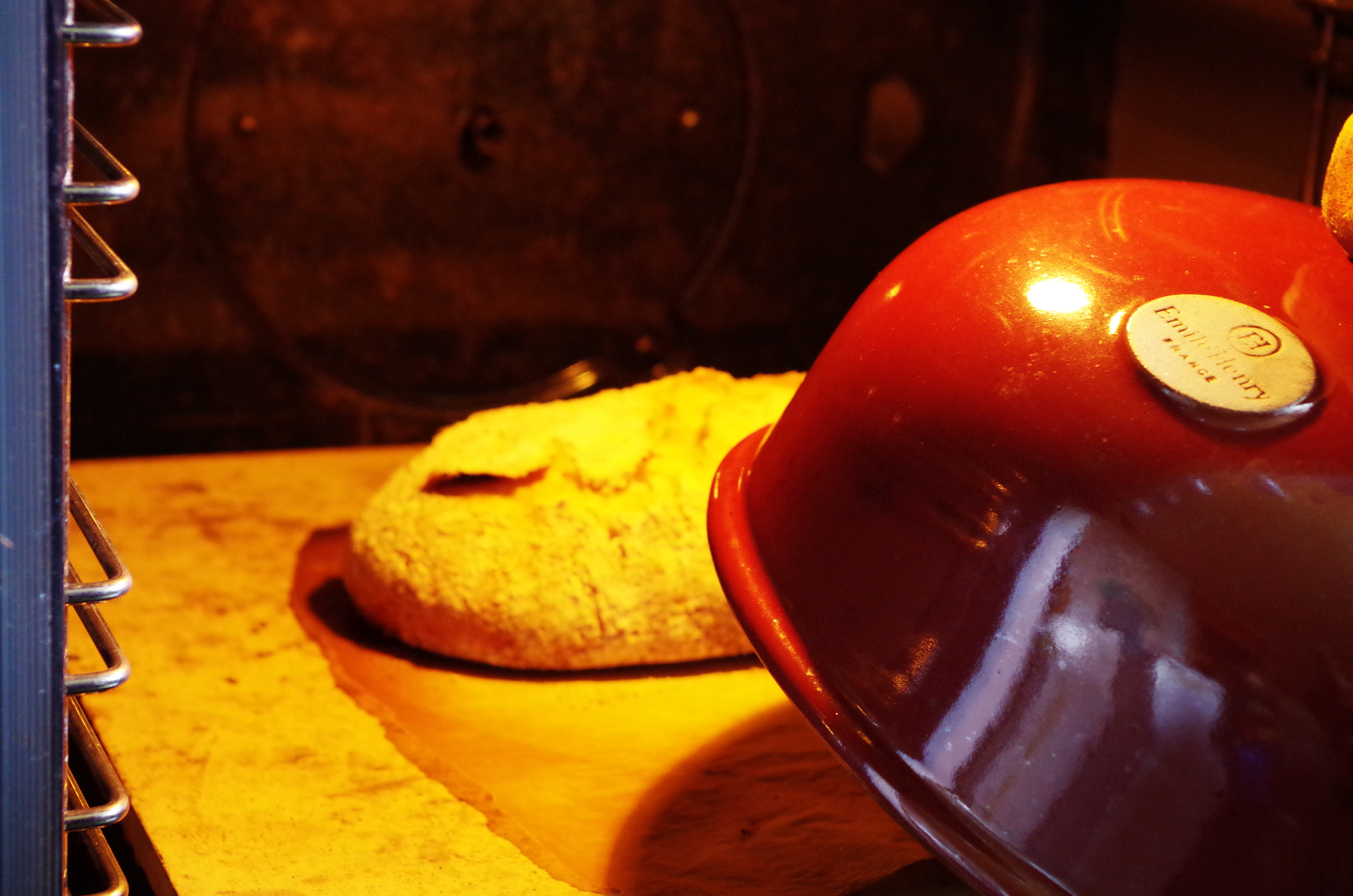 - Включите духовку греться вместе с колпаком и камнем до 240-250 гадусов. Я обычно пользуюсь керамическим колпаком от Emile Henry и шамотным камнем.