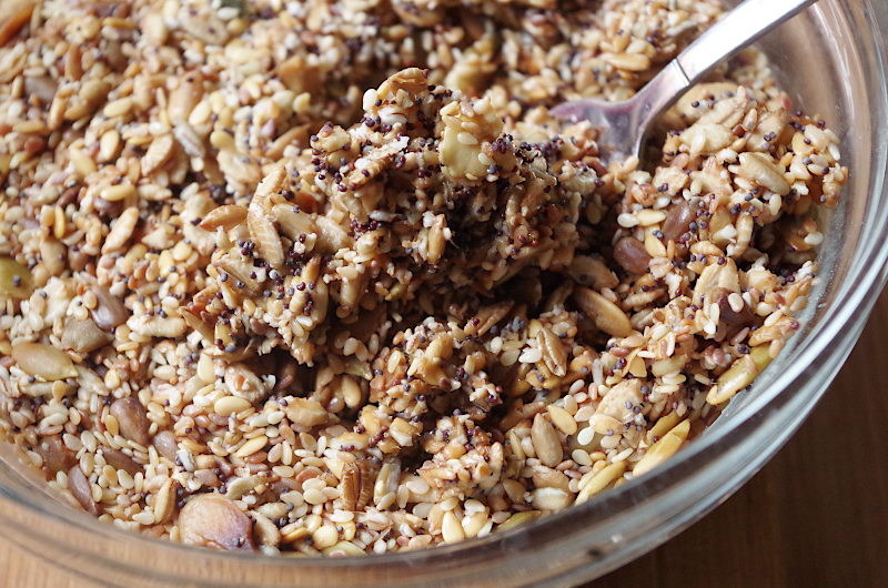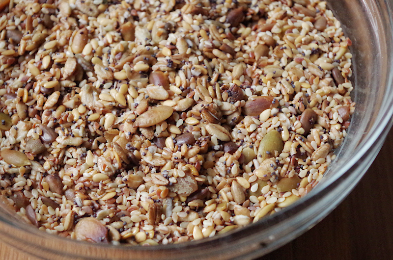Вместо черного кунжута, который слабо проявлялся, взяли светлые хорошо поджаренные семена, добавили мак и все, кроме льна и мака, поджарили, чтоб усилить аромат.