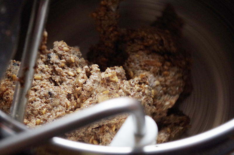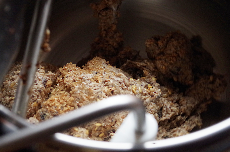 Смешайте в деже тестомеса закваску, заварку, мочку из семян и хлопьев и муку, начните активный замес. Тесто может казаться сухим, но не спешите добавлять воду, дайте тесту хорошо смешаться, оно и без добавления лишней воды получится довольно вязким. Воду добавляйте только при необходимости.