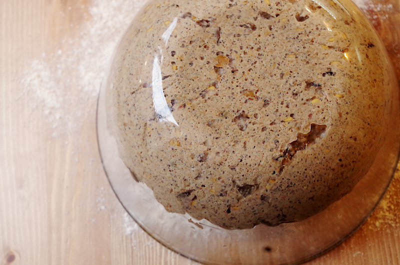 Хлеб здорово поднимется м на поверхности начнут слегка проступать пузыри. Не ждите большого количества пузырей, иначе в печи верхушка осядет.