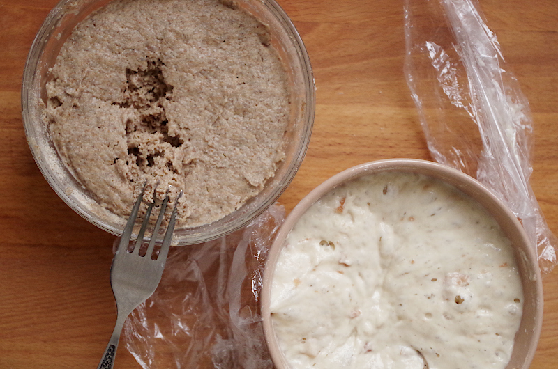 Я предложила всем желающим месить тесто влажностью 80% вместе с нами на эфире и, поскольку эфир был объявлен на вечер (18:00 по Киеву и 19:00 по Москве), у участников было около 8-6 часов для того, чтоб получить зрелую закваску. Поскольку я понятия не имею, когда кто поставит свою закваску, при каких температурах у вас будет происходить брожение, предложила пропорции, которые точно не подведут (и сама же им воспользовалась):