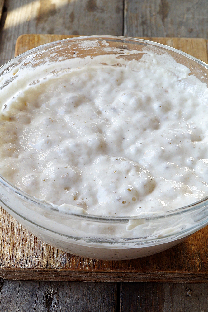 Смешала и поставила на 12 часов в духовку с включенной лампочкой. Ориентируйтесь прежде всего на то, как выглядит опара, она должны быть полностью созревшей, допускается небольшое проседание в центре. На поверхности должно быть много пузырей.