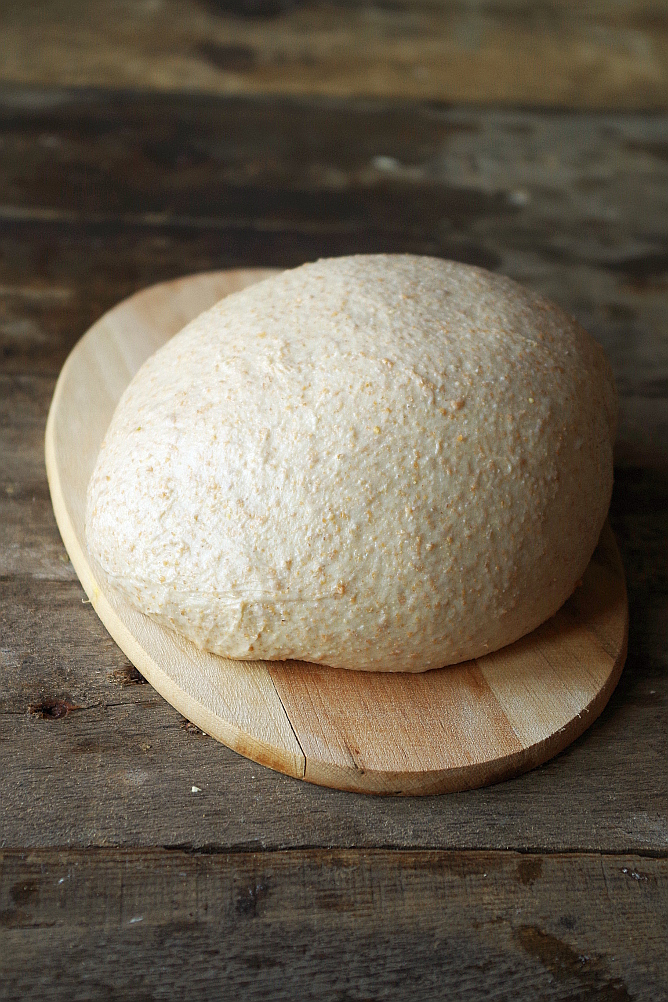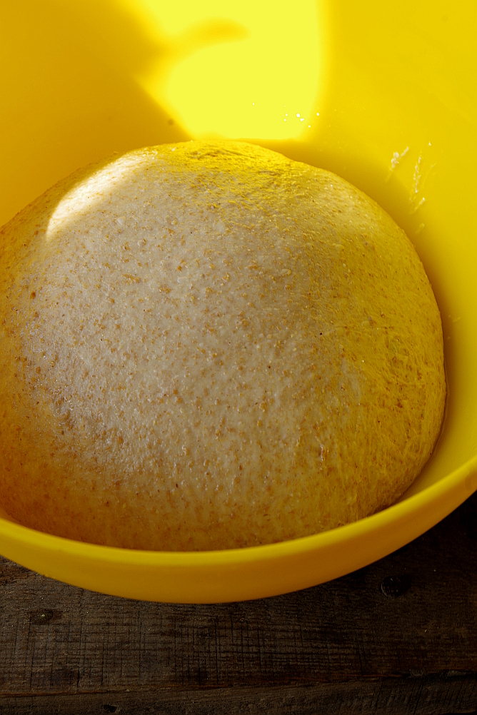 В это время в духовке пеклось что-то еще, поэтому тесто подходило просто на столе при температуре около 26 градусов. Чуть больше чем через час оно было пышным и хорошо подросшим.