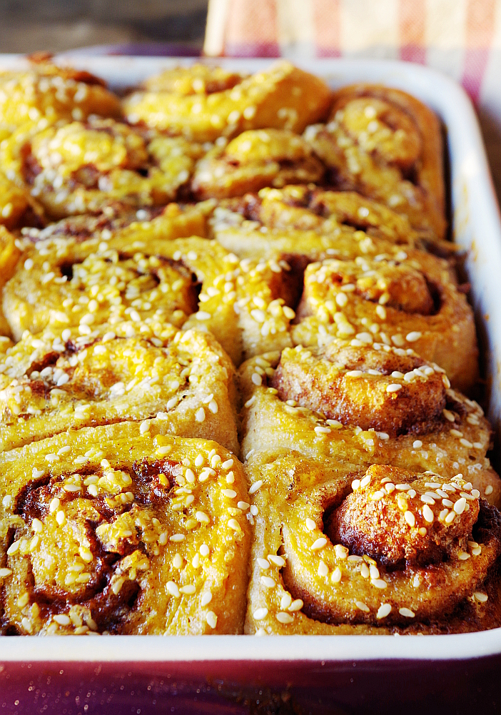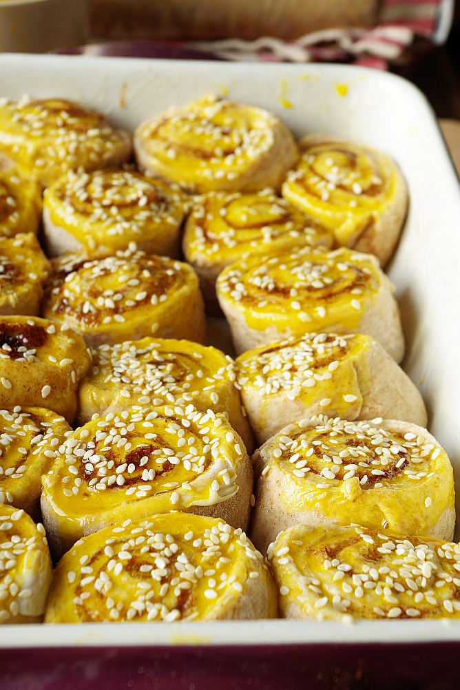 Керамическую форму для запекания смазала сливочным маслом и выложила булочки. Зачем-то сразу после этого смазала желтком, посыпала остатками сахарно-коричной смеси и кунжутом. Вообще, если будете печь эти булочки, смазывайте верхушку, когда они расстойятся, то есть, перед выпечкой. А расстойка - около 60-80 минут при температуре, приближенной к 30 градусам (если в комнате около 26-27 - будет достаточно).