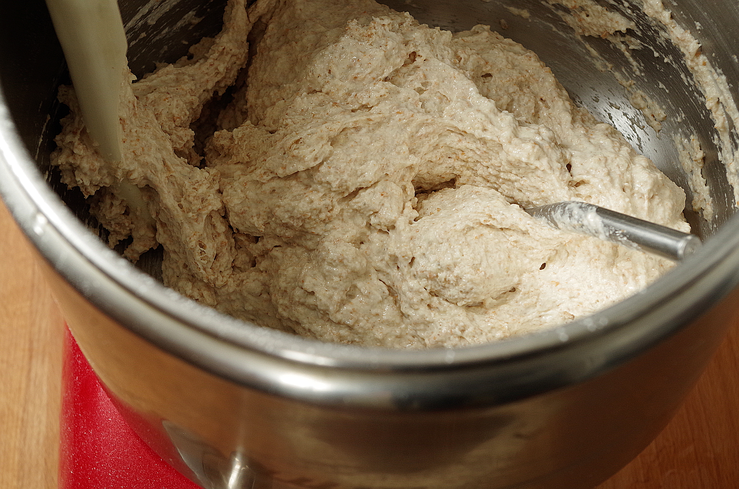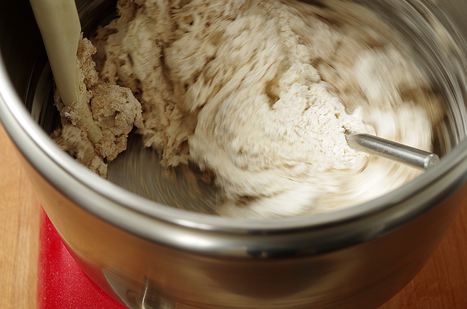 Процесс замес астандартный - сначала смешайте всю муку, всю воду и закваску, чтоб вся мука увлажнилась, оставьте на 30 минут и начните активный замес. Я сначала смолола свежую муку, - и пшеничную, и капельку ржаной, - а потом загрузила все в чашу Ankarsrum Original.