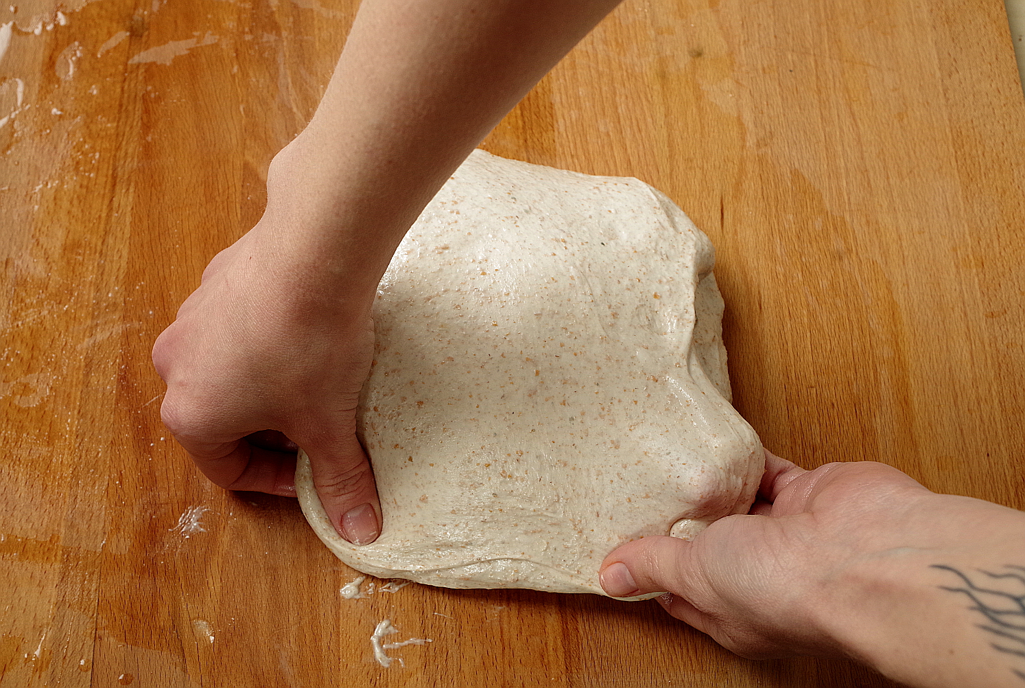 Сначала вывалите тесто на стол, немнго растяните, возьмитесь за левый край теста, хорошо растяните и перебросьте на противоположный край. Повторите то же самое с правым краем теста.