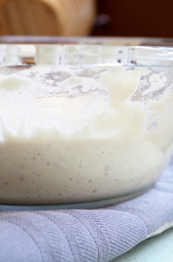 Да, стартера реально нужно совсем каплю, кому-то может показаться, что это экстремально мало и что опара не созреет. Созреет — проверено неоднократно. За 12 часов при 20 градусах опара доходит как раз до нужной кондиции, когда она почти на пике, пузыри на поверхности только начали проступать, она еще не успела стать кислой на вкус и едва запахла йогуртом.