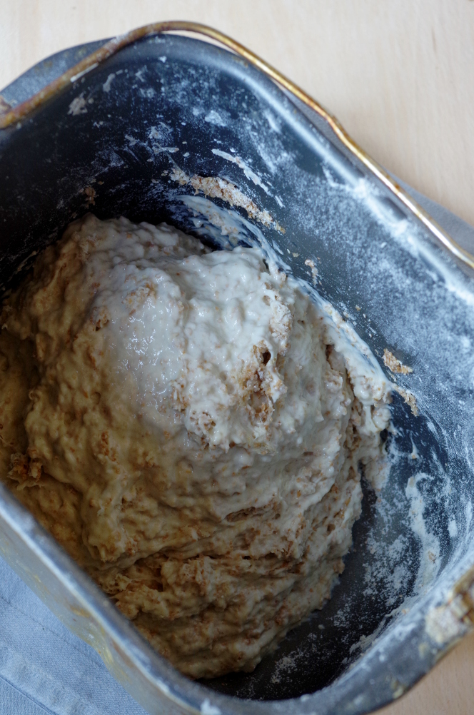 2) Начинаем замес. Сначала тесто будет довольно влажным и липким, но по ходу замеса будет становиться все более эластичным.