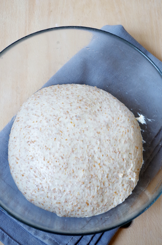 Готовое тесто сворачиваем шариком и кладем в миску, смазанную растительным маслом — бродить около 2 часов. Тесто должно увеличиться примерно вдвое. Хорошо, когда миска прозрачная и можно посмотреть на пузыри воздуха в нем и оценить степень «подхода».