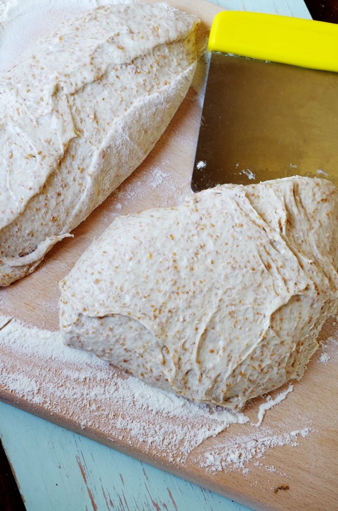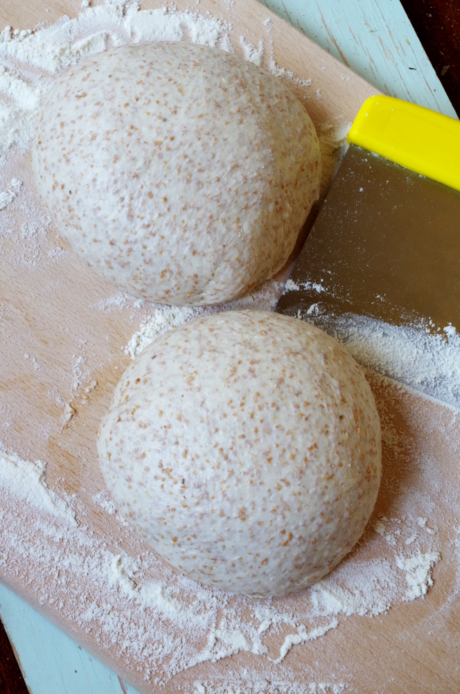 Выкладываем на рабочую поверхности, делим на две части, округляем и даем 10 минут предварительной расстойки.